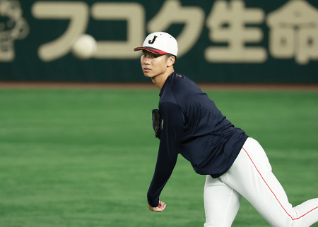 野球日本代表「侍ジャパン」は14日、韓国代表との強化試合(15、16日)が行われる東京ドームで公式練習に臨み、キャッチボールや守備練習、フリー打撃などで調整した。15日は曽谷(写真)が先発する。 【時事通信社】