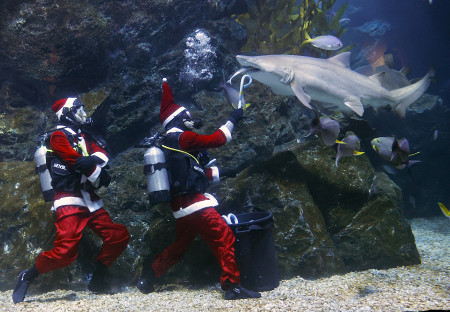 18日、バンコクの水族館で、サンタクロースの衣装を着たダイバーから餌をもらうサメ。クリスマスシーズンに観光客を呼び込むための特別イベントで、25日まで続く。 【EPA時事】
