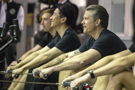 米国を訪問中の小泉進次郎防衛相は15日朝(日本時間同日夜)、ワシントン近郊の米軍基地で、ヘグセス国防長官と共に米軍式の筋力トレーニング「ミリタリー・エクササイズ」を体験した(米国防総省提供) 【時事通信社】