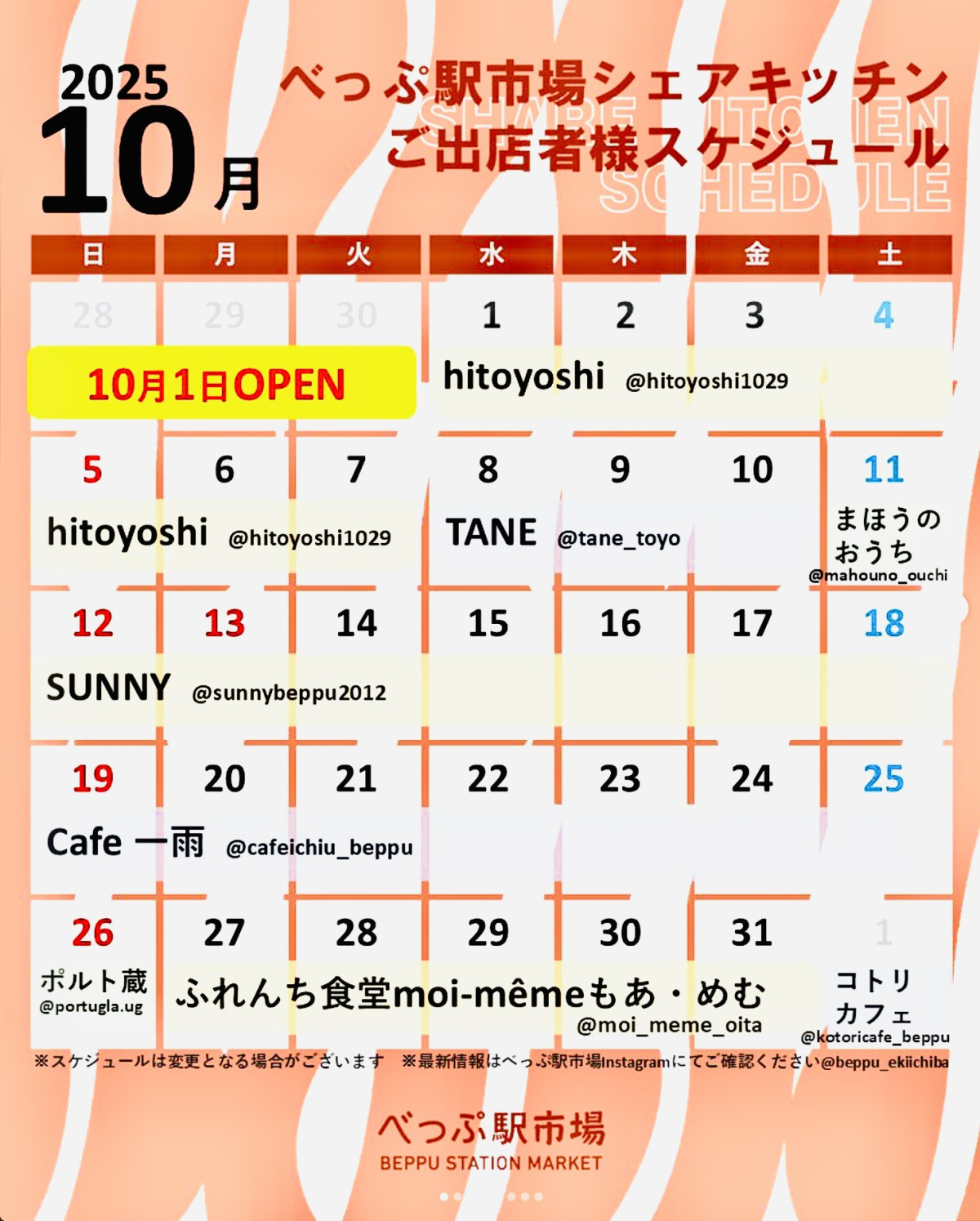 べっぷ駅市場「シェアキッチン」出店スケジュール