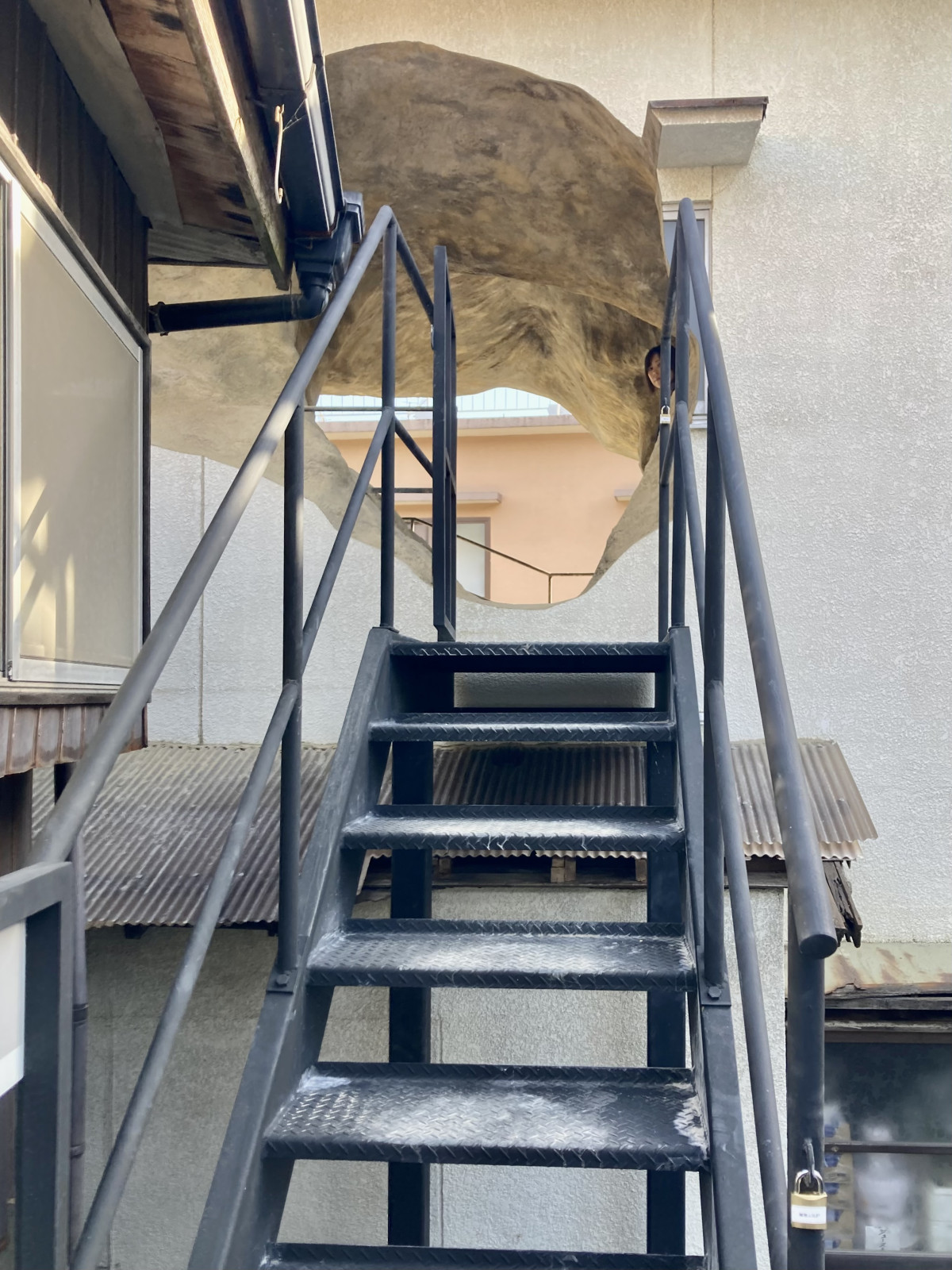 【北側の階段から内部へ(別府・鉄輪の「space II」)】北側の外部階段から内部に入ることができ、外の湯煙や水路を流れる水音などを楽しむことができる。