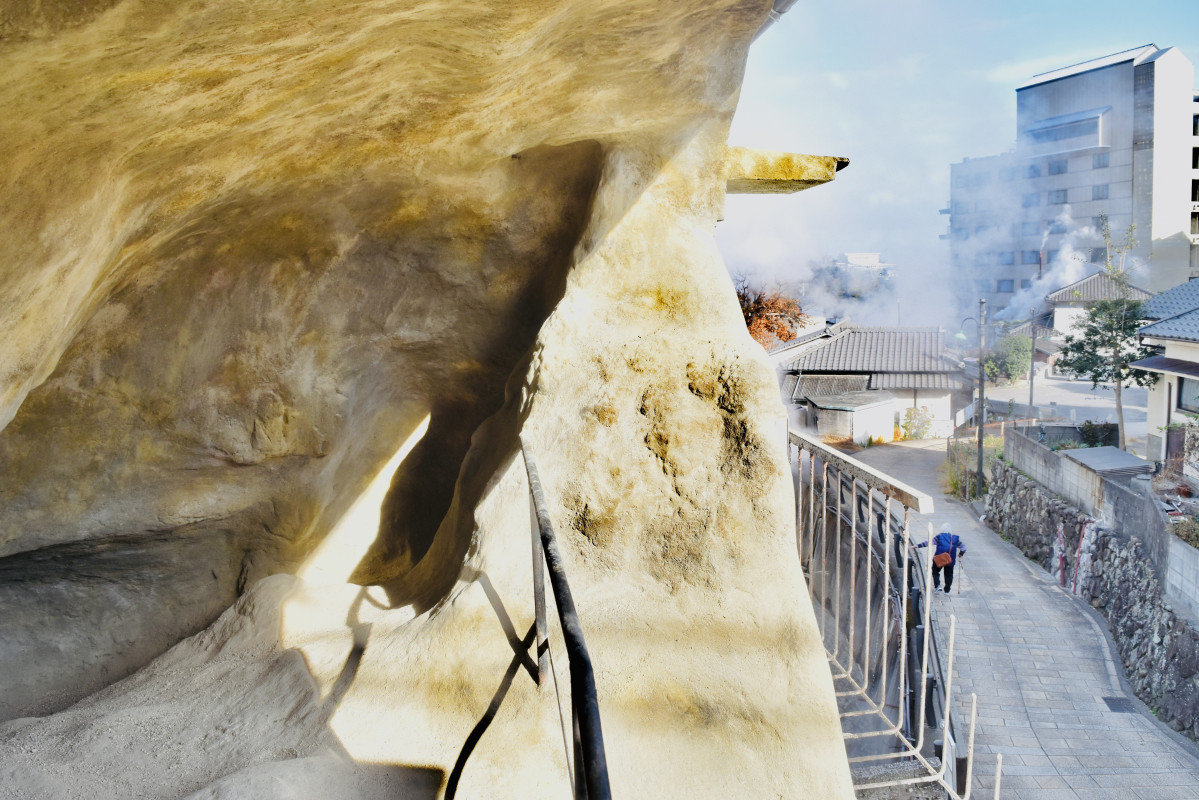 【内部から湯煙が上る風景を楽しめる(別府・鉄輪の「space II」)】北側の外部階段から内部に入ることができ、外の湯煙や水路を流れる水音などを楽しむことができる。