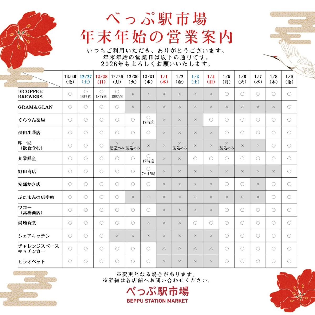 【べっぷ駅市場年末年始の営業案内】年末年始の各店の営業予定はべっぷ駅市場のインスタグラムで確認できる。