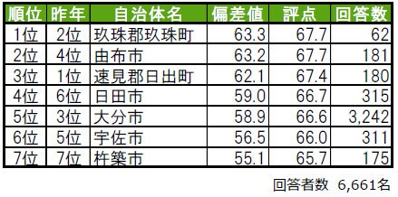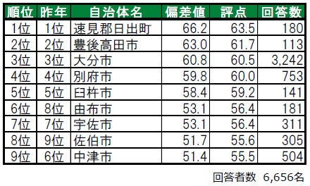 住み続けたい街1位は5年連続で速見郡日出町。2位は4年連続で豊後高田市。3位は2年連続で大分市。