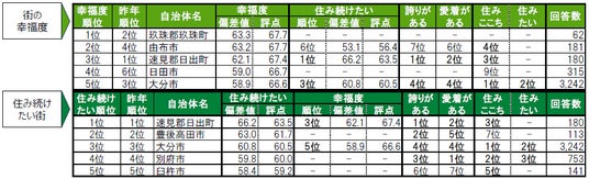 街の幸福度は、1位玖珠郡玖珠町、2位由布市、3位速見郡日出町。