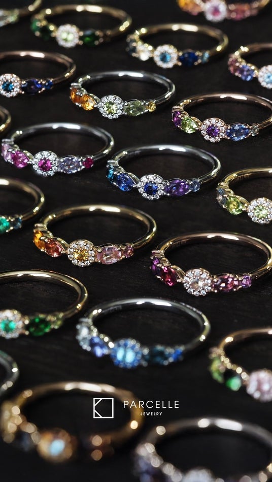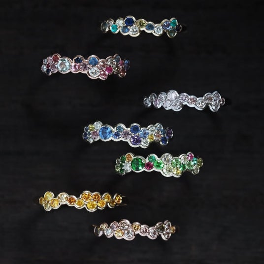 種類やサイズの異なるカラーストーンやダイヤモンドを、職人の手で隙間なく敷き詰めたパヴェジュエリー。半レール留めで石を守りつつ、丸みのある愛らしいシルエットと吸い付くような着け心地を両立しています。