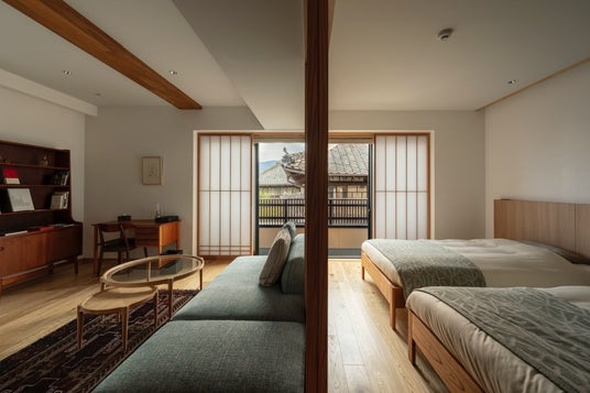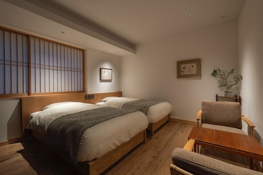 森岡書店の雰囲気を感じていただける、小さな美術館のような一部屋で、ソファに座りながら、貴重な本やアーティストの作品とともに特別な時間をお過ごしいただけます。(山側ツインルーム/2名1室 お一人様22,800~)