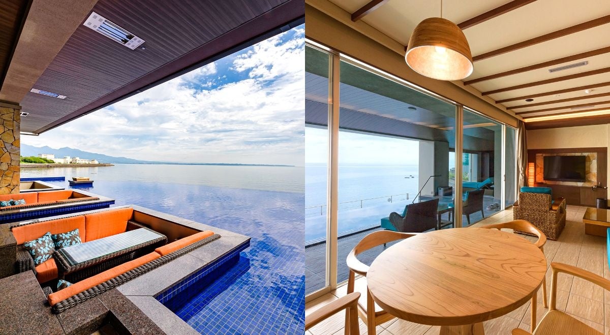 別府の全室オーシャンビュー&半露天風呂付き客室、刻々と変わりゆく別府湾の眺めとともにくつろぎのお時間をお過ごし下さい。大浴場は通称”海抜0m”と言われるほど海に近く、湯船に肩まで浸かれば、まるで海に浮いているかのような気分での湯浴みを体験。
