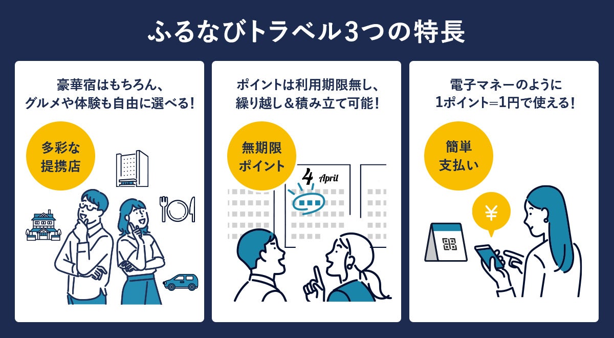 「ふるなびトラベル」は、ふるさと納税の寄附で得たふるなびトラベルポイントを、提携店(ホテル・飲食店・アクティビティ施設など)でのお支払いに無期限で利用できるサービスです。
