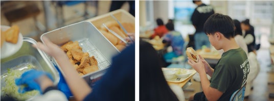佐伯市内の全小中学校の学校給食で「アイゴのフライ”アイボー”」を提供。パン給食の日では開いたパンにアイゴを挟みお手製のフィッシュバーガーを作って食べる子がいたり、ご飯給食の日も「アイゴ美味しい」とアイゴをおかずに箸が進む様子が印象的でした。給食時には、アイゴや海の学びを深めることのできるオリジナルのランチョンマットを配布するとともに、昨年度事業にて地元高校生と制作した学習用動画「アイゴから学ぶ海の変化」の映像を流してもらい、食べながらも気軽に楽しく学べる工夫を施しました。また、給食時に行われる校内放送でも各校の放送担当の生徒がアイゴの紹介を行い、アイゴや佐伯ウラオモテアクトの取組について知ってもらう機会となりました。