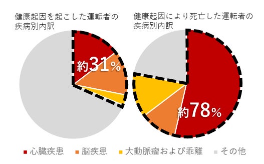 過去に同事故を起こした運転者の疾病別内訳は心臓疾患(心筋梗塞等)、脳血管疾患(くも膜下出血等)、大動脈解離など高血圧を主なリスク要因とする疾患が約31%を占め、運転者が死亡した事故では3つの疾患で約78%を占めます*1。高血圧に適切に対処、管理することは事故発生を未然に防ぐカギです。