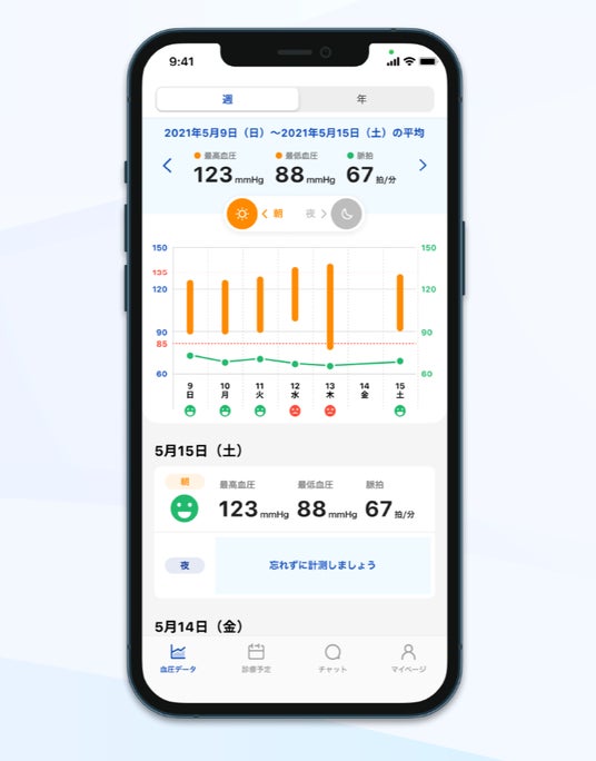 高血圧、脂質異常症をはじめとした慢性疾患に特化したオンライン診療サービスで、初診からオンラインでの診療によって「通院しない便利さ」と、専用アプリと家庭血圧計を使った継続的な治療サポートにより「いつも繋がり見守られる安心」を提供します。