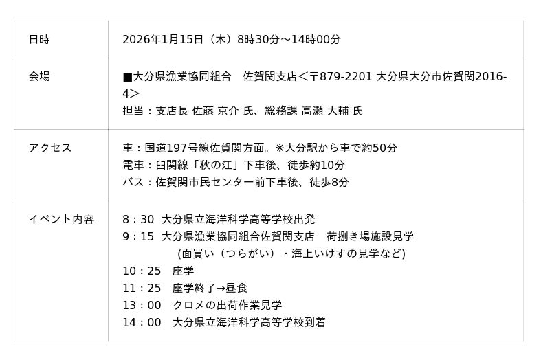 一般社団法人うみらいふは、2026年1月15日(木)に大分県立海洋科学高等学校の生徒と共に学ぶ「体験学習ツアー第三弾」を実施いたします。今回は、全国的に有名なブランド魚「関あじ関さば」の秘密を探るべく、県立海洋科学高校の生徒たちが大分県漁業協同組合佐賀関支店にお邪魔し、ブランド確立までの取組みや荷捌き場施設で”海上いけす”や”面買い(つらがい)”などを見学して出荷までの流れを学びます。また、この日に解禁されるクロメ漁の出荷作業も見学する予定です。