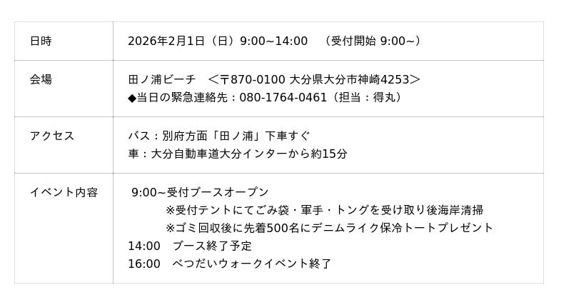 一般社団法人うみらいふは、2026年2月1日(日)に第21回べつだいウォーク実行委員と連携し、べつだいウォークに参加する皆さまへ「海洋問題に対する意識向上」「健康促進」を図ることを目的に、会場にてウォーキングしながら海岸清掃を行う「ビーチクリーンコース」を設けます。12時スタートの「のんびりコース」「はりきりコース」でのウォーキング前の準備運動、ウォーキング後のクールダウン用コースとして、多くの方にご参加いただけるようPRしてまいります。参加者へは専用の受付ブースで軍手、トング、ごみ袋等の清掃グッズを配布しビーチでの清掃&ウォーキングに参加していただき、収集したごみと引き換えに定先着500名様へCHANGE FOR THE BLUEのロゴ入りオリジナル「デニムライク保冷トート(S)」をプレゼントいたします。このイベントは、日本財団が推進する海洋ごみ対策プロジェクト「海と日本プロジェクト・CHANGE FOR THE BLUE」の一環で開催するものです。