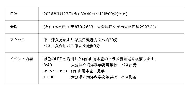 一般社団法人うみらいふは、2026年1月23日(金)に大分県立海洋科学高等学校の生徒と共に学ぶ「体験学習ツアー第四弾」を実施いたします。大分県は養殖ヒラメの生産量が日本一(※農林水産省 令和6年海面漁業生産統計調査データ)を誇ることから、今回は「養殖ヒラメ」に焦点をあて、大分県津久見市にある有限会社 山尾水産(以下、(有)山尾水産と表記)にご協力いただきヒラメ養殖場の現場を視察させていただきます。