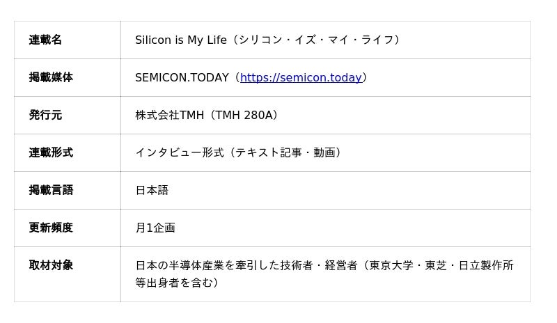 株式会社TMH(本社:大分県大分市、以下「当社」)が運営する半導体業界特化型メディア「SEMICON.TODAY」は、日本の半導体産業を世界最高水準へと牽引してきた先駆者たちの半生と知見を記録・発信する連載企画「Silicon is My Life(シリコン・イズ・マイ・ライフ)」を開始いたします。