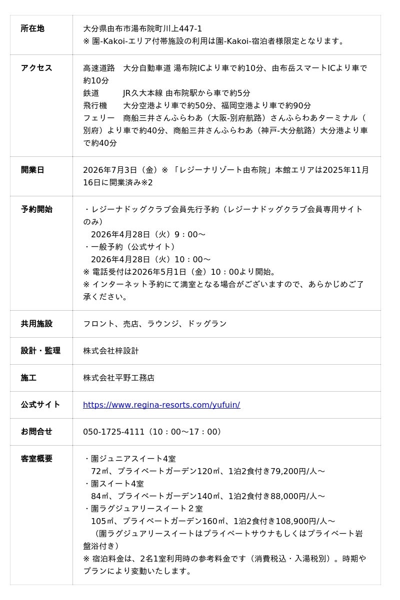 東京建物株式会社(本社:東京都中央区、代表取締役 社長執行役員 小澤 克人、以下「東京建物」)と東京建物リゾート株式会社(本社:東京都中央区、代表取締役 社長執行役員 加藤 久利、以下「東京建物リゾート」)は、昨年2025年11月16日に開業した、愛犬同伴型ラグジュアリーリゾートホテル「レジーナリゾート由布院」において、プレミアムゾーン「圍-Kakoi-」(読み:かこい)が2026年7月3日に開業することをお知らせします。また、開業に先立ち4月28日10:00から公式サイトで宿泊予約受付を開始します。