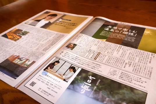 温泉研究者・湯治宿オーナーへのインタビューや若者座談会など、取材に基づくコンテンツを掲載。タブロイド判・フルカラー全8ページ。